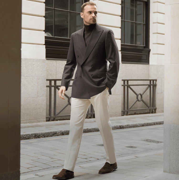 Our jackets are cut slightly shorter, broadening the shoulders to provide a more elegant silhouette to your suit.