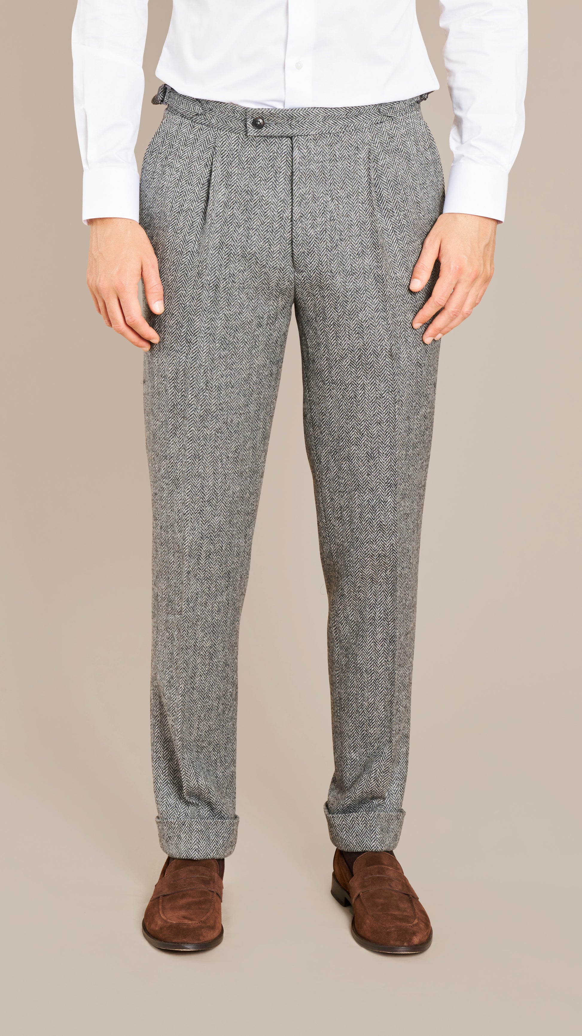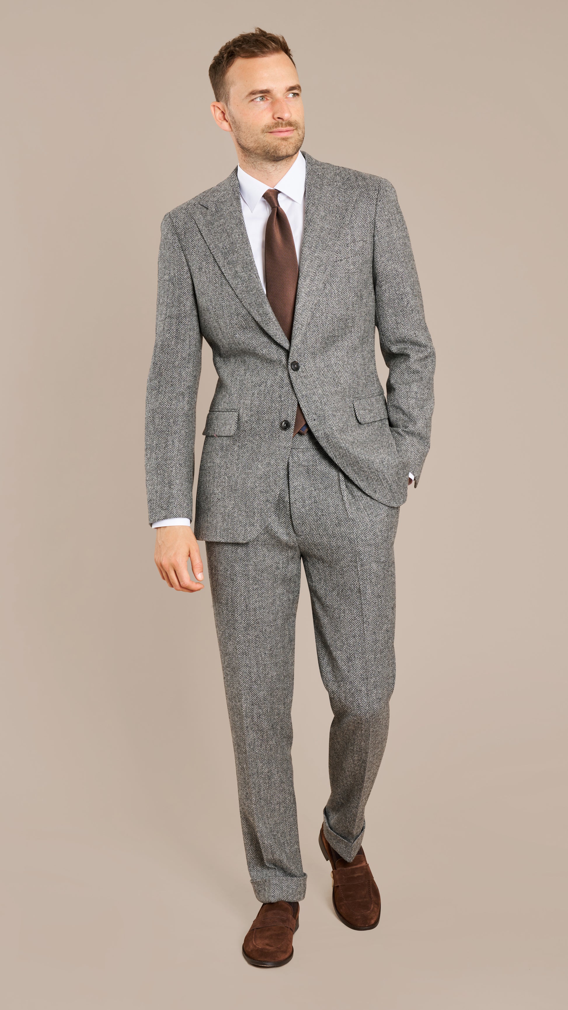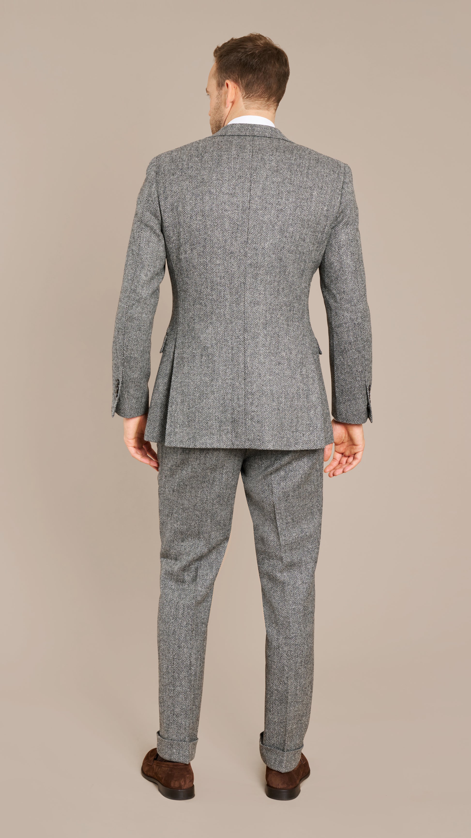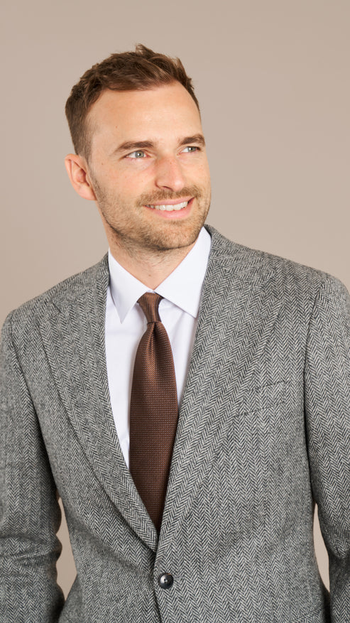 Woven in England by Holland & Sherry, this Mid Grey Herringbone Tweed Suit embodies timeless British craftsmanship. The textured herringbone weave and soft wool flannel provide warmth, structure, and a refined country aesthetic that transitions effortlessly into the city.