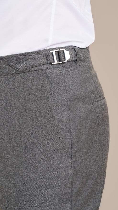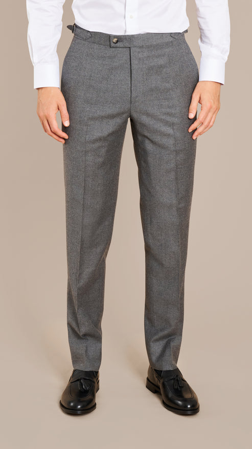 Woven in Yorkshire by Alfred Brown, this double-milled flannel is crafted from 100% Merino wool for a luxuriously soft yet substantial feel. The 300gsm weight and smooth brushed finish make it ideal for the colder seasons, offering both warmth and refinement. A timeless grey hue and natural drape make this suit a versatile choice for business, formal occasions, or elegant winter weddings.