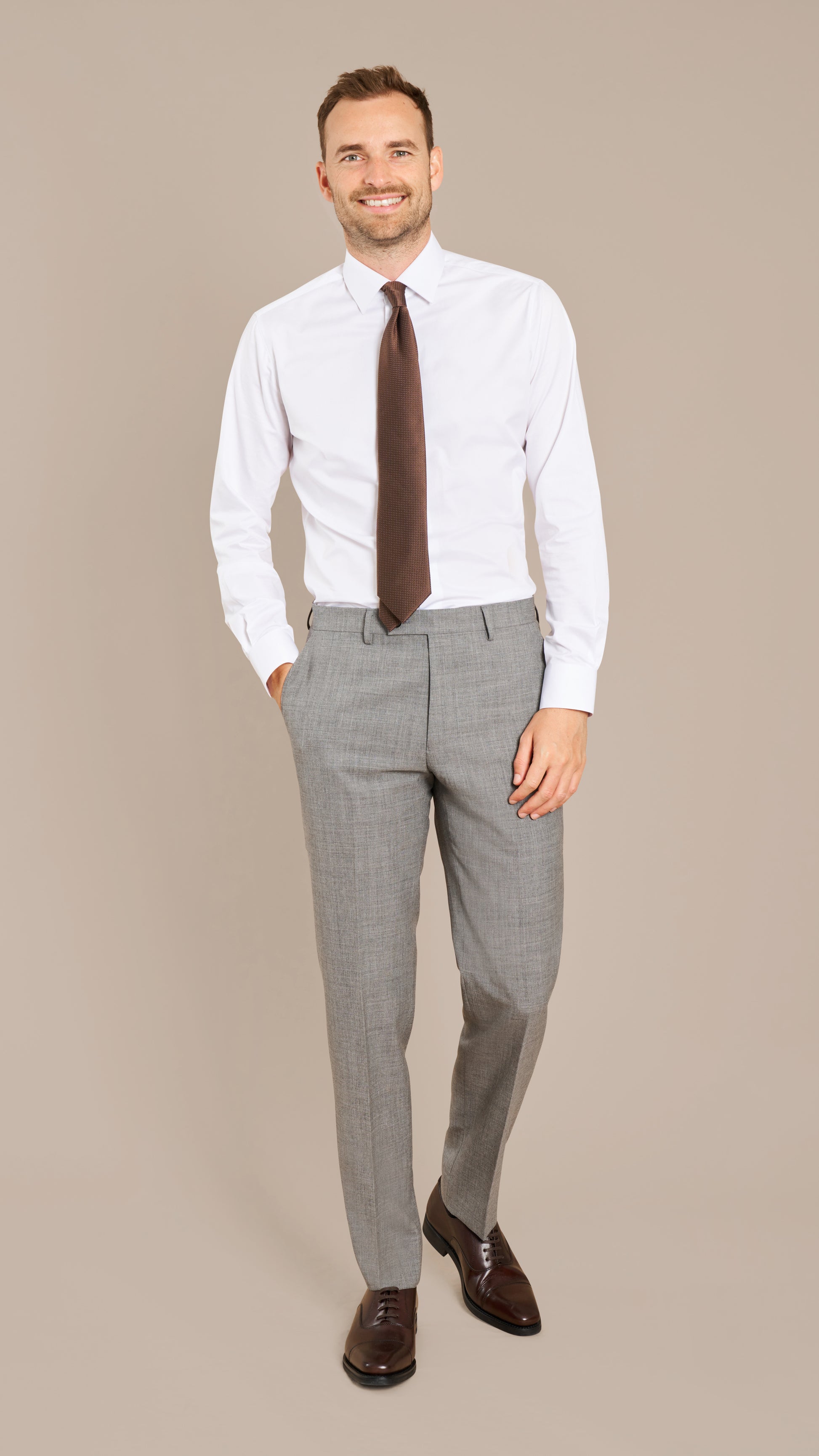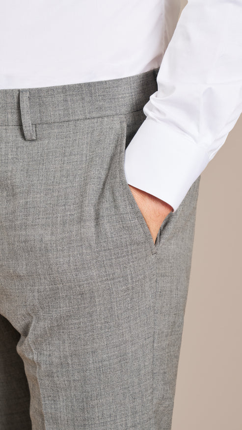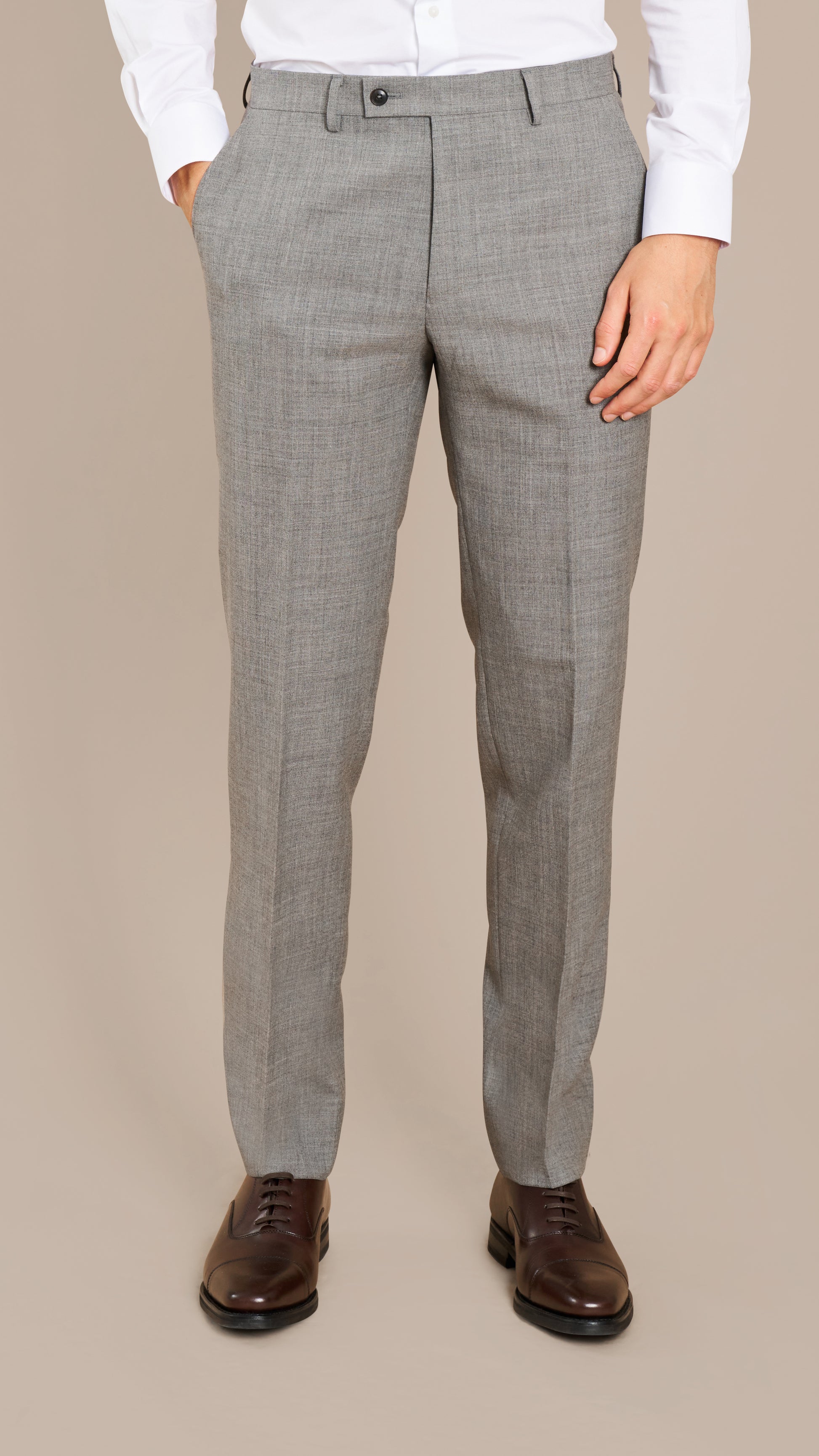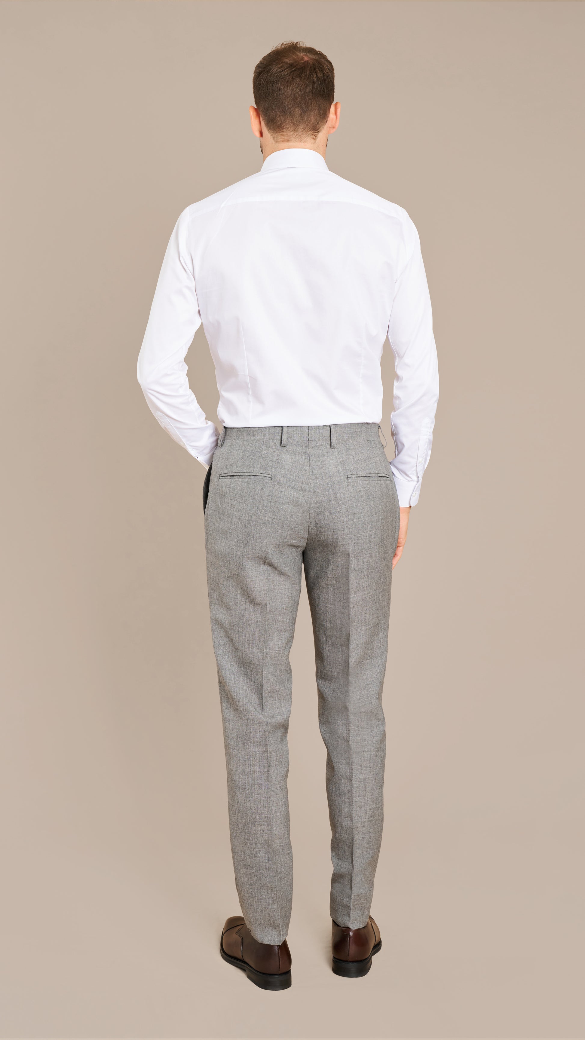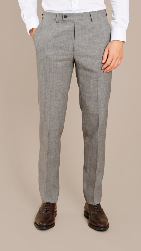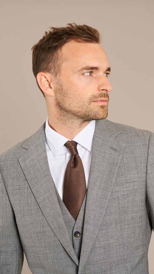 Woven in Yorkshire by Alfred Brown, this mid-grey high-twist wool suit combines lightness, breathability, and crease resistance for effortless wear. The open weave and crisp handle make it a perfect three-season travel suit, maintaining structure and comfort through any journey. Refined yet practical, it’s a versatile choice for business, formal occasions, or modern grooms.