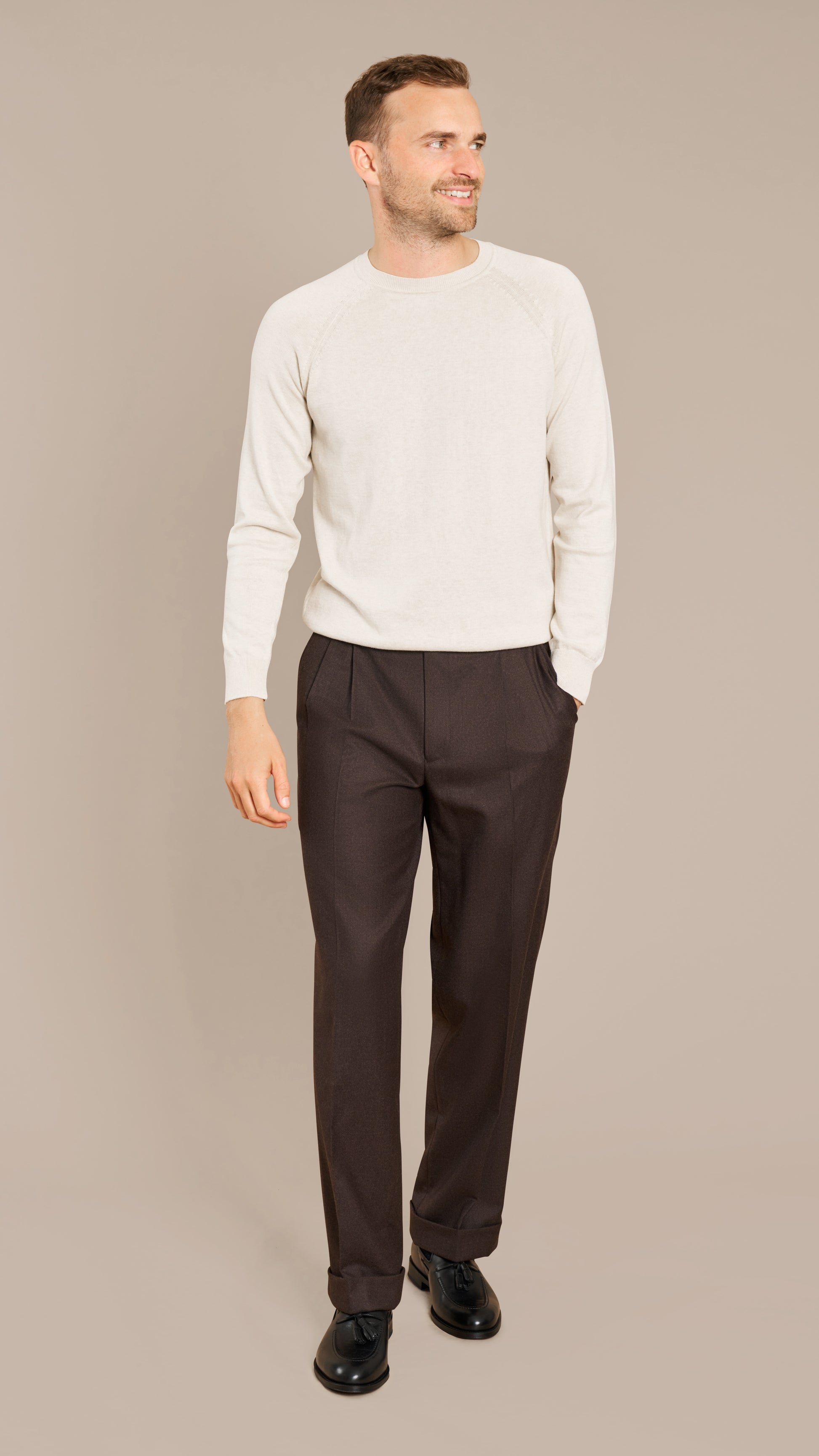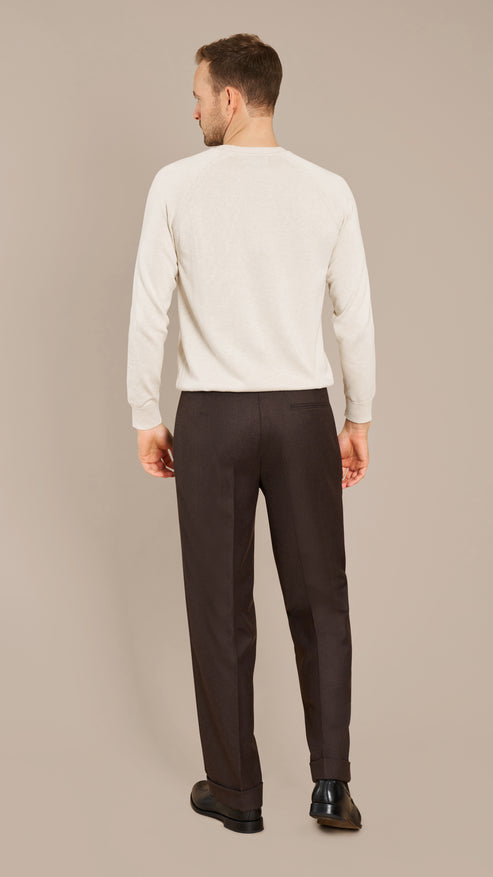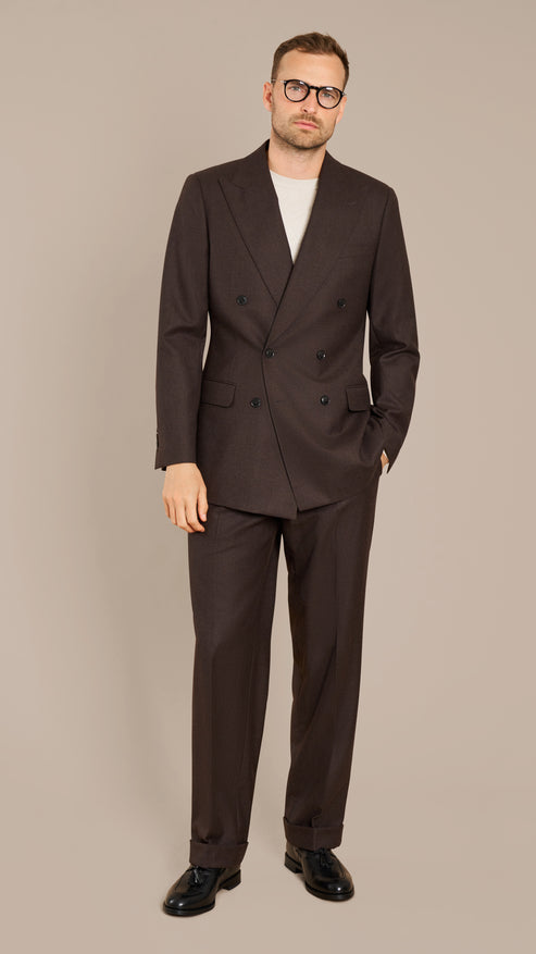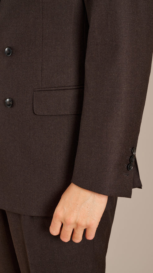 This Dark Brown Flannel Suit combines modern elegance with classic tailoring. Crafted from a soft wool flannel, it offers warmth, structure, and a smooth hand-feel, ideal for autumn and winter wear. The rich chocolate hue lends a contemporary twist to a timeless wardrobe staple.