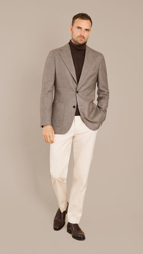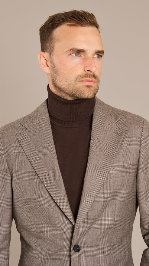 Tailored from pure wool, this Mid Brown Flannel Glencheck Jacket blends traditional British patterning with modern sophistication. The soft flannel finish provides warmth and comfort, while the subtle glencheck weave adds depth and character, perfect for autumn and winter layering.