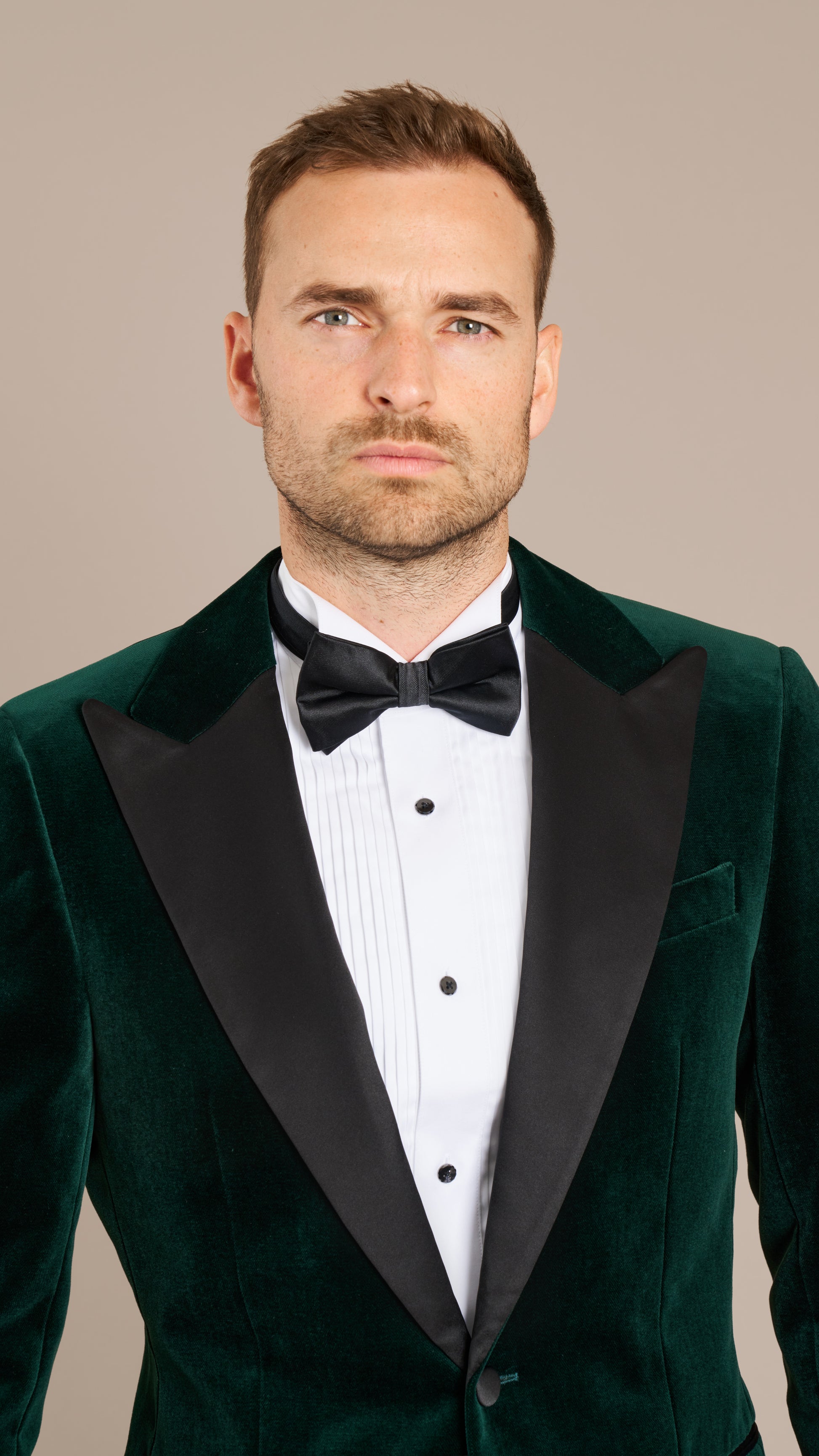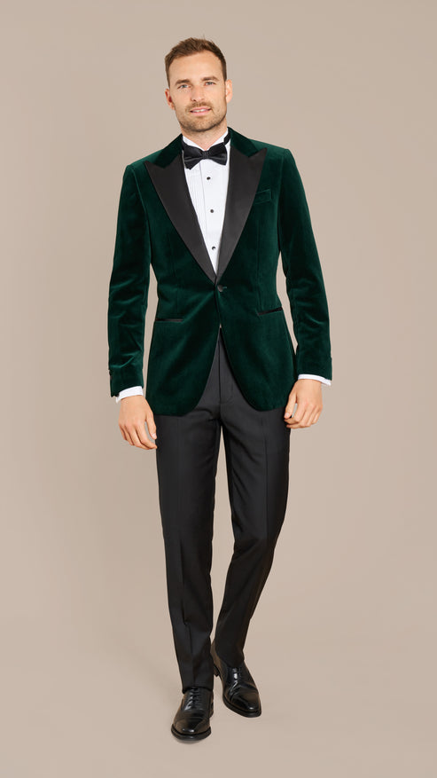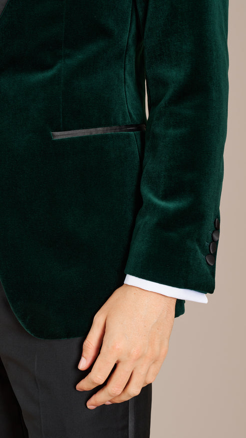 Crafted from luxurious velvet by Scabal, this Forest Green Dinner Jacket delivers richness, depth, and impeccable evening style. The plush cotton-modal blend offers a soft hand-feel and a subtle sheen, making it a striking yet refined choice for formal occasions.